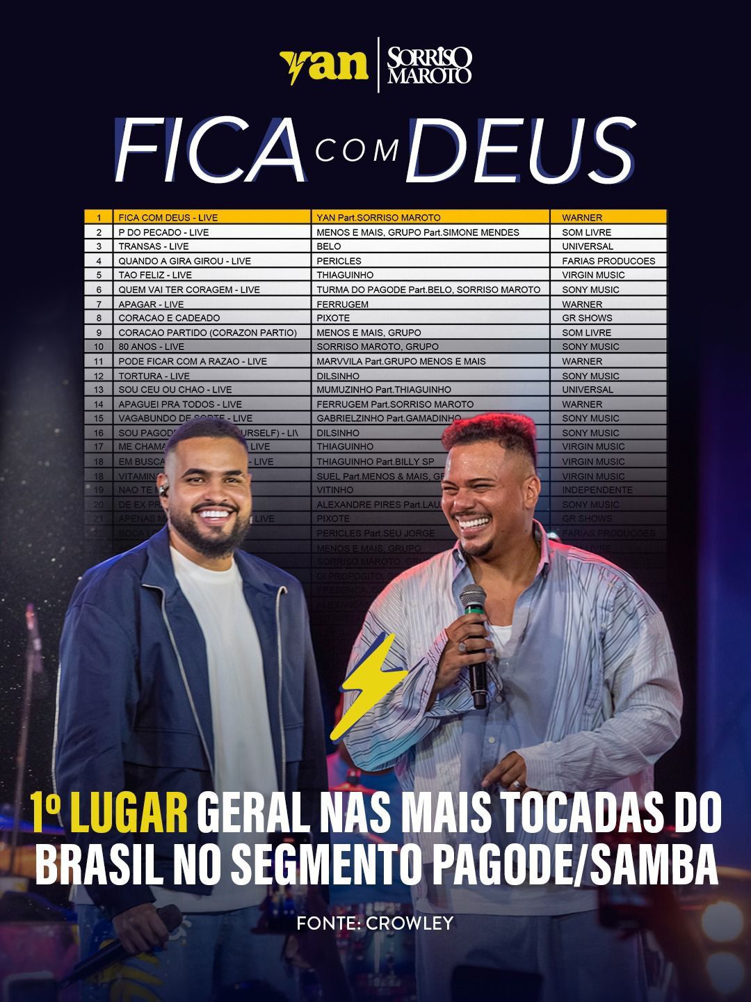 A nova geração do pagode tem um nome em destaque: Yan. O cantor, que vem conquistando o público apaixonado pelo ritmo, acaba de alcançar um marco expressivo. De acordo com a Crowley, empresa referência no monitoramento de execuções musicais no Brasil, “Fica com Deus”, sua parceria com o Sorriso Maroto, é a música mais tocada do país no segmento pagode/samba, ocupando o topo das rádios de norte a sul.